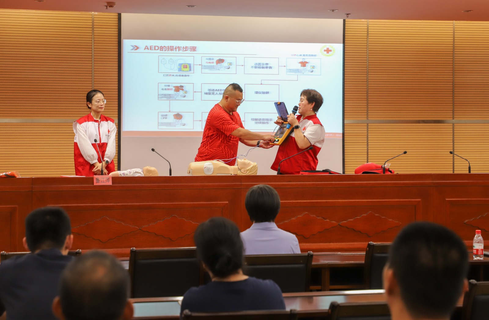 講座伊始,魯江萍老師以紅十字運(yùn)動(dòng)的發(fā)展歷程切入,詳細(xì)介紹了紅十字會(huì)的主要職責(zé)。而后,魯老師聚焦實(shí)操技能,重點(diǎn)講解心臟驟停的識(shí)別要點(diǎn),針對(duì)心肺復(fù)蘇(CPR)與自動(dòng)體外除顫器(AED)的核心知識(shí)展開(kāi)了細(xì)致的教學(xué)——老師們現(xiàn)場(chǎng)分解演示胸外按壓、人工呼吸的操作技巧,以及AED開(kāi)機(jī)、貼電極片等關(guān)鍵步驟,帶領(lǐng)大家同步練習(xí)按壓節(jié)奏,在整齊節(jié)拍中精準(zhǔn)把握要領(lǐng)。