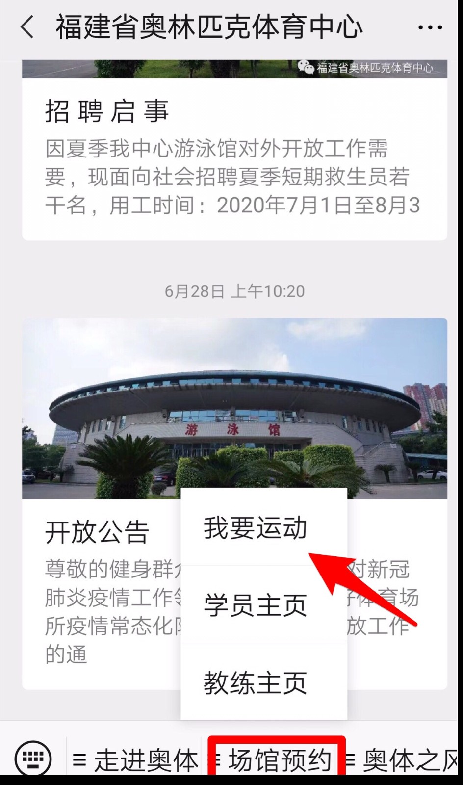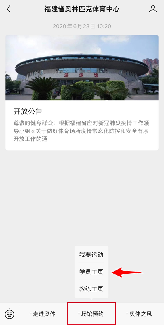 第一步:關(guān)注“福建省奧林匹克體育中心”微信公眾號。