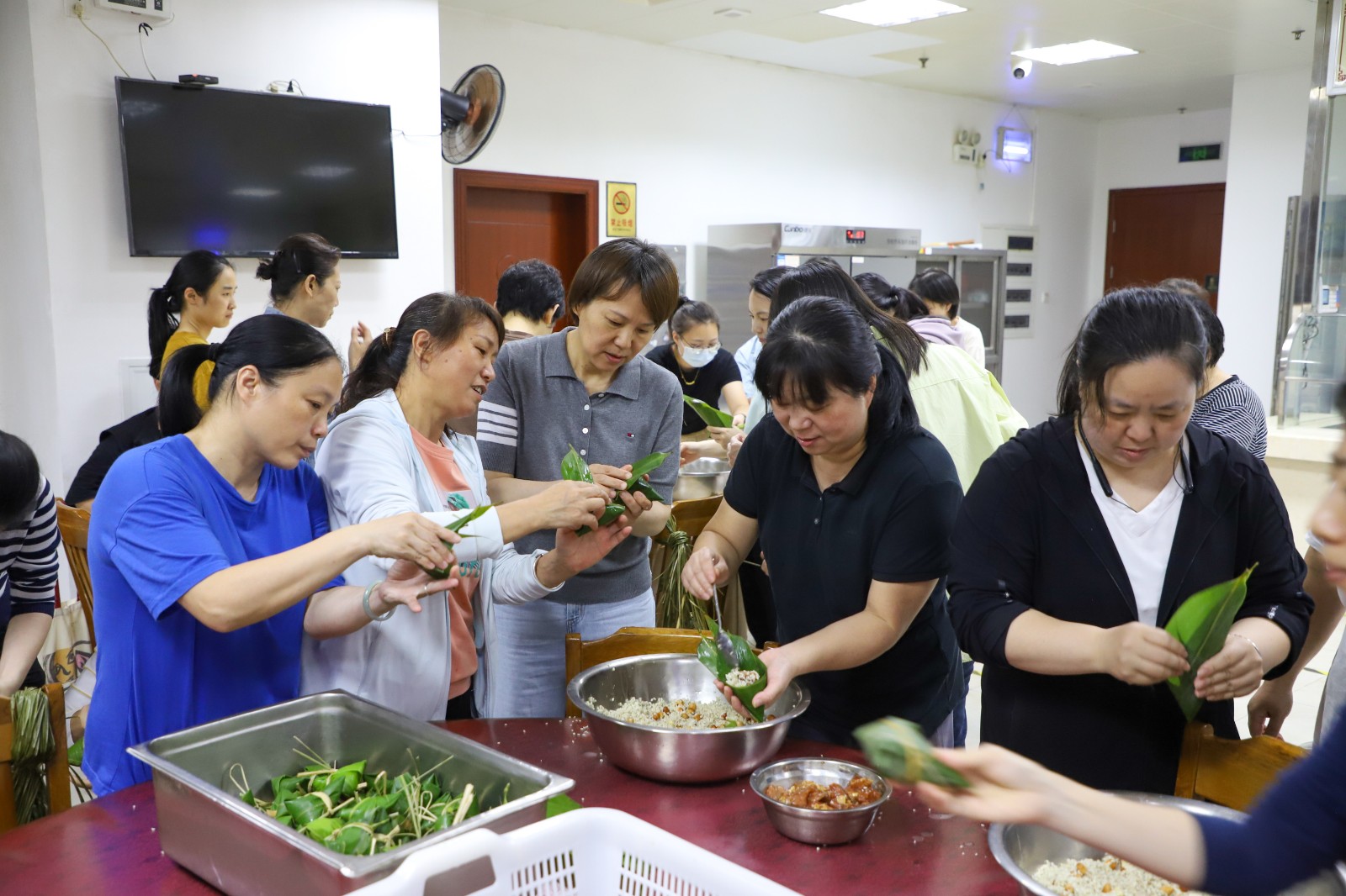 活動現(xiàn)場,食堂工作人員精心準(zhǔn)備了包粽所需的材料,在桌上整齊地?cái)[放著粽葉、糯米、蛋黃、五花肉等,包粽子小能手們早早地來到了活動現(xiàn)場,大家圍在一起巧手包粽子。首先卷粽葉,做成漏斗狀,再填糯米、加餡料,然后壓緊實(shí)、封口、扎捆......。大家齊心合力、分工協(xié)作、相互配合,一個個三角形、牛角形、錐形、長條形等各式各樣的粽子在職工手中誕生了。在包制過程中,大家相互交流經(jīng)驗(yàn)和技巧,歡聲笑語,其樂融融。